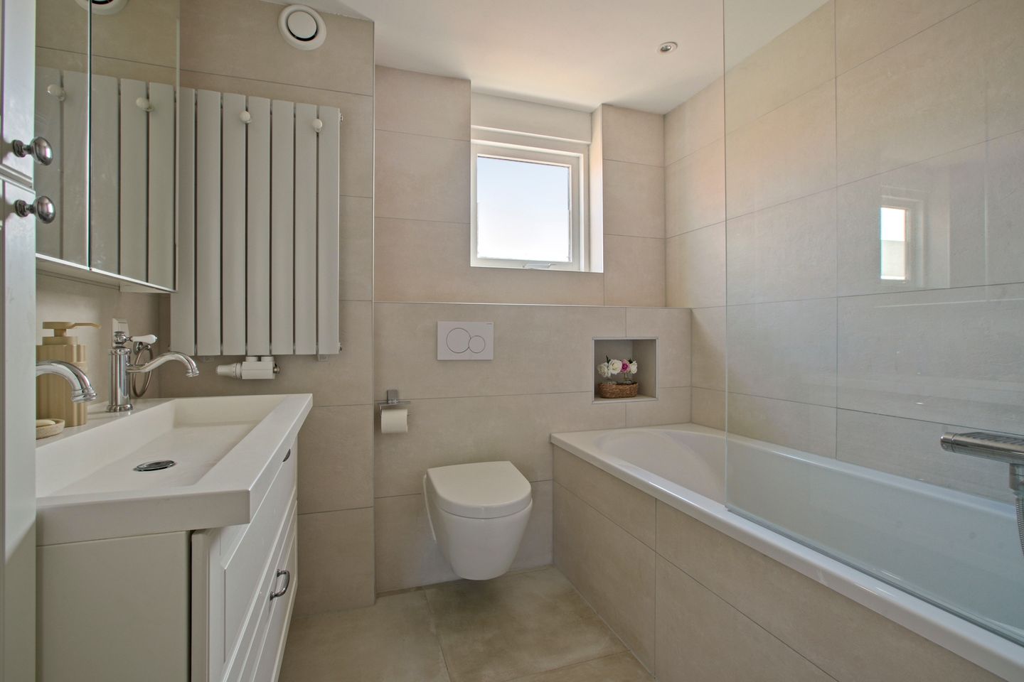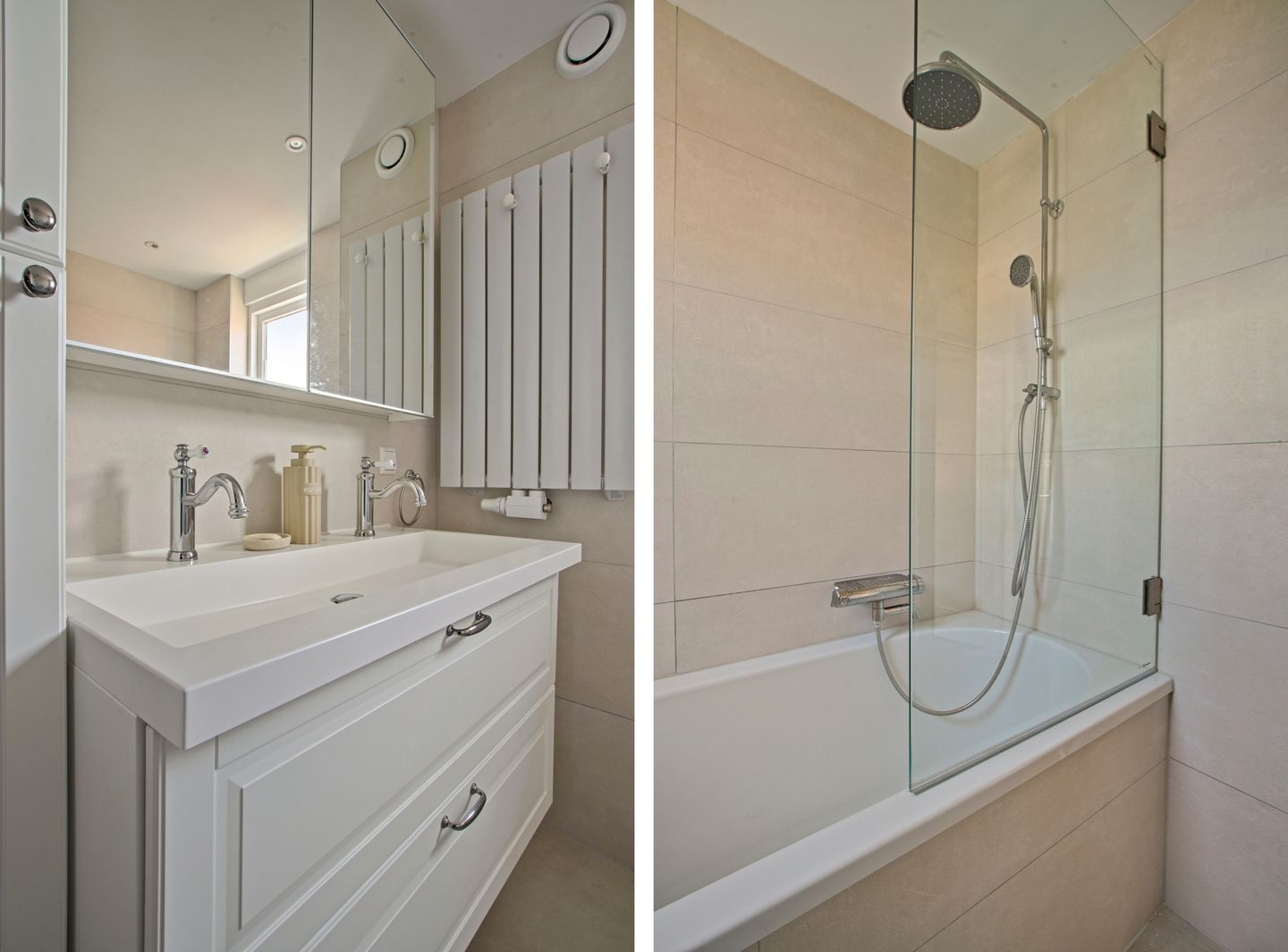 The first floor comprises two spacious bedrooms and a modern bathroom, renovated in 2023. The bathroom is fitted with a shower, bathtub, and a vanity unit with washbasin and double taps. The master bedroom can easily be divided into two separate bedrooms if desired.