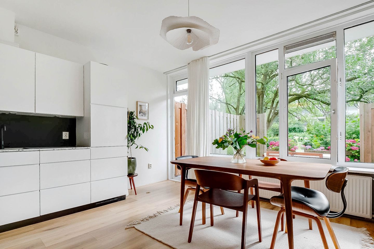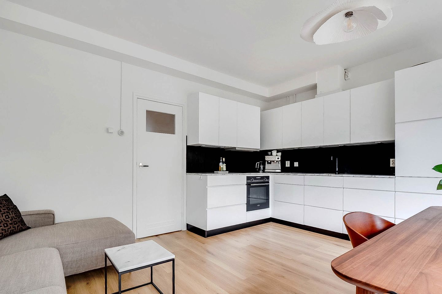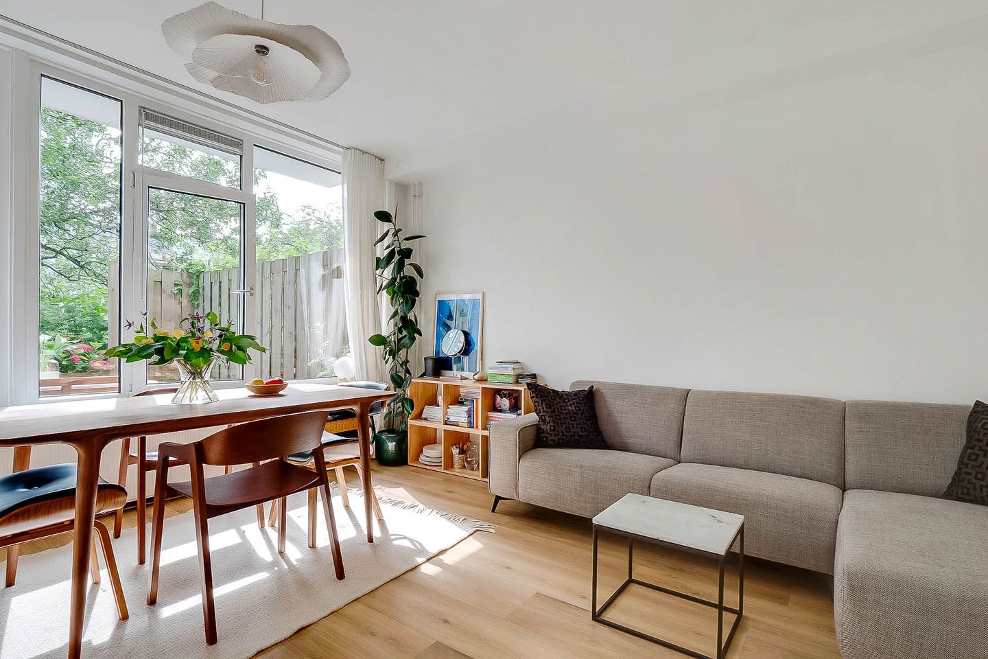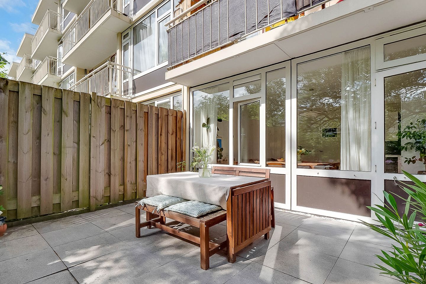 Lovely light two-room apartment in Amsterdam South (Gelderlandpleinbuurt) with an east-facing garden. This apartment is an ideal starter home. You enter the hall of this lovely ground-floor home through your own entrance. The hall provides access to all rooms and has a built-in wardrobe. The spacious garden-oriented living room has large windows that let in a lot of light, the patio door gives access to the garden, which is located on the east. You can enjoy the sun here, or dine outside with friends. The garden of approximately 20 m² offers a lot of privacy due to the green vegetation surrounding and bordering the courtyard of the apartment complex. The open kitchen is equipped with a modern kitchen unit with various built-in appliances from the Siemens brand, namely refrigerator with freezer, induction hob, convection oven, extractor hood and dishwasher.