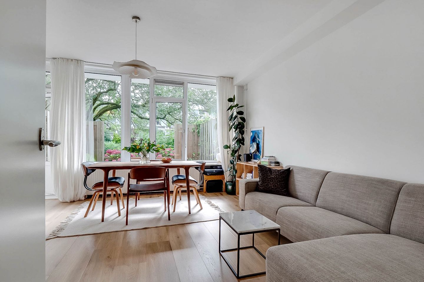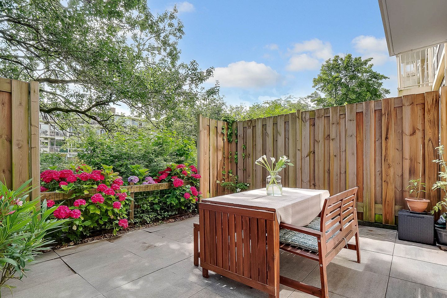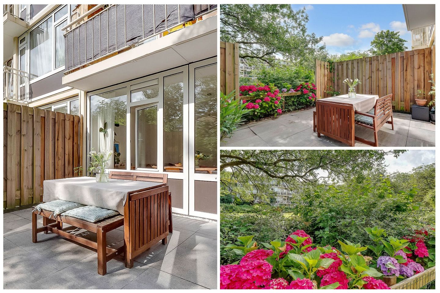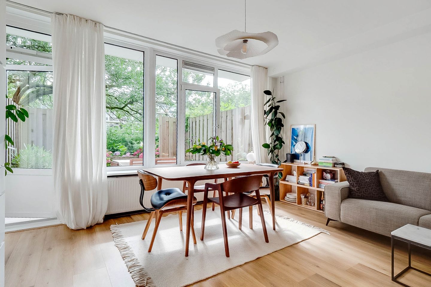 Lovely light two-room apartment in Amsterdam South (Gelderlandpleinbuurt) with an east-facing garden. This apartment is an ideal starter home. You enter the hall of this lovely ground-floor home through your own entrance. The hall provides access to all rooms and has a built-in wardrobe. The spacious garden-oriented living room has large windows that let in a lot of light, the patio door gives access to the garden, which is located on the east. You can enjoy the sun here, or dine outside with friends. The garden of approximately 20 m² offers a lot of privacy due to the green vegetation surrounding and bordering the courtyard of the apartment complex. The open kitchen is equipped with a modern kitchen unit with various built-in appliances from the Siemens brand, namely refrigerator with freezer, induction hob, convection oven, extractor hood and dishwasher.