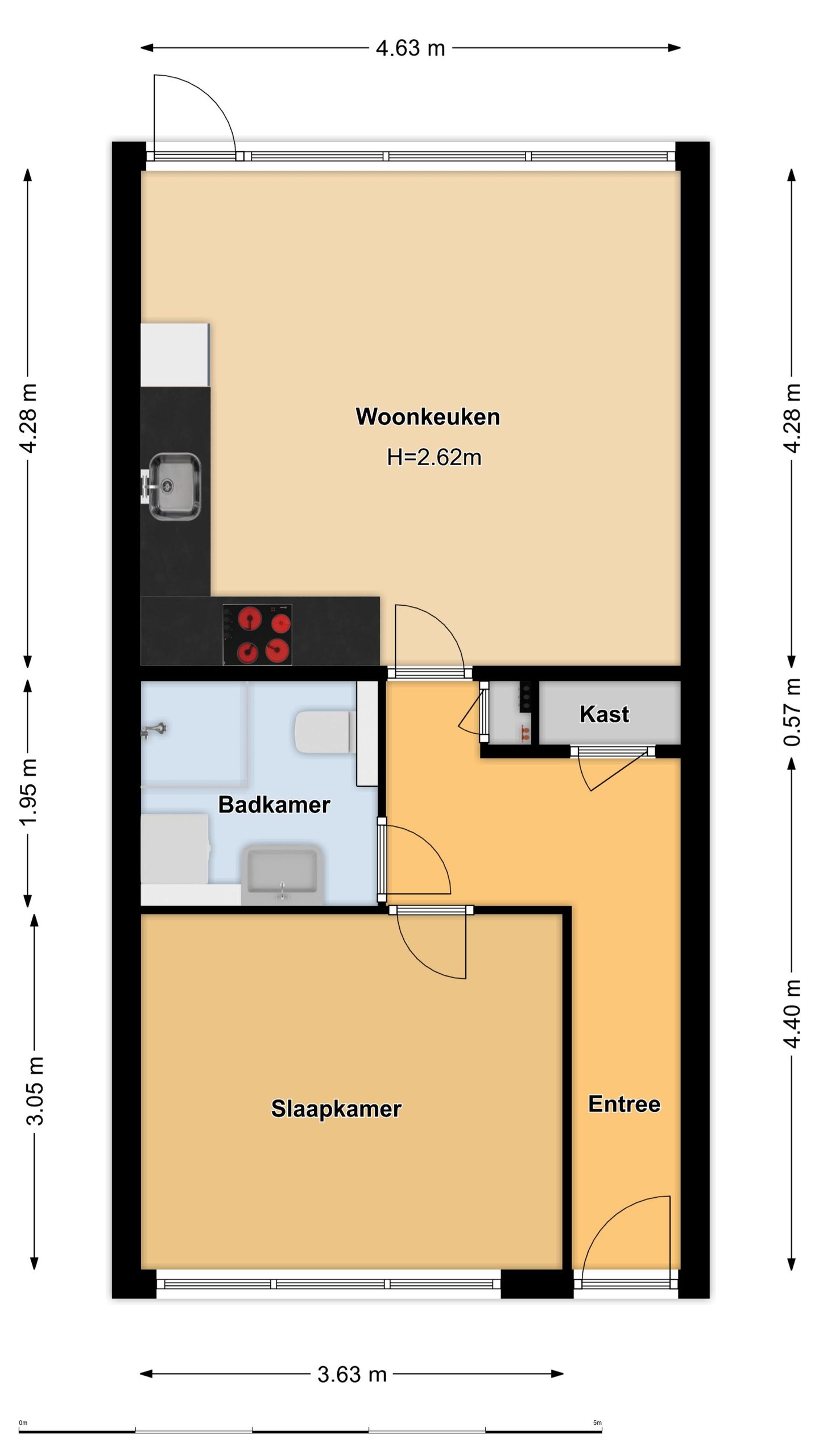 At the front of the house there is a spacious bedroom with a handy built-in wardrobe. The hall provides access to the meter cupboard, an efficient wardrobe and the bathroom. The bathroom has a neat walk-in shower, sink and toilet. The house is well maintained, plastered walls and a modern laminate floor. Finally, there is an individual (bicycle) storage room within the complex. The house has its own storage room.