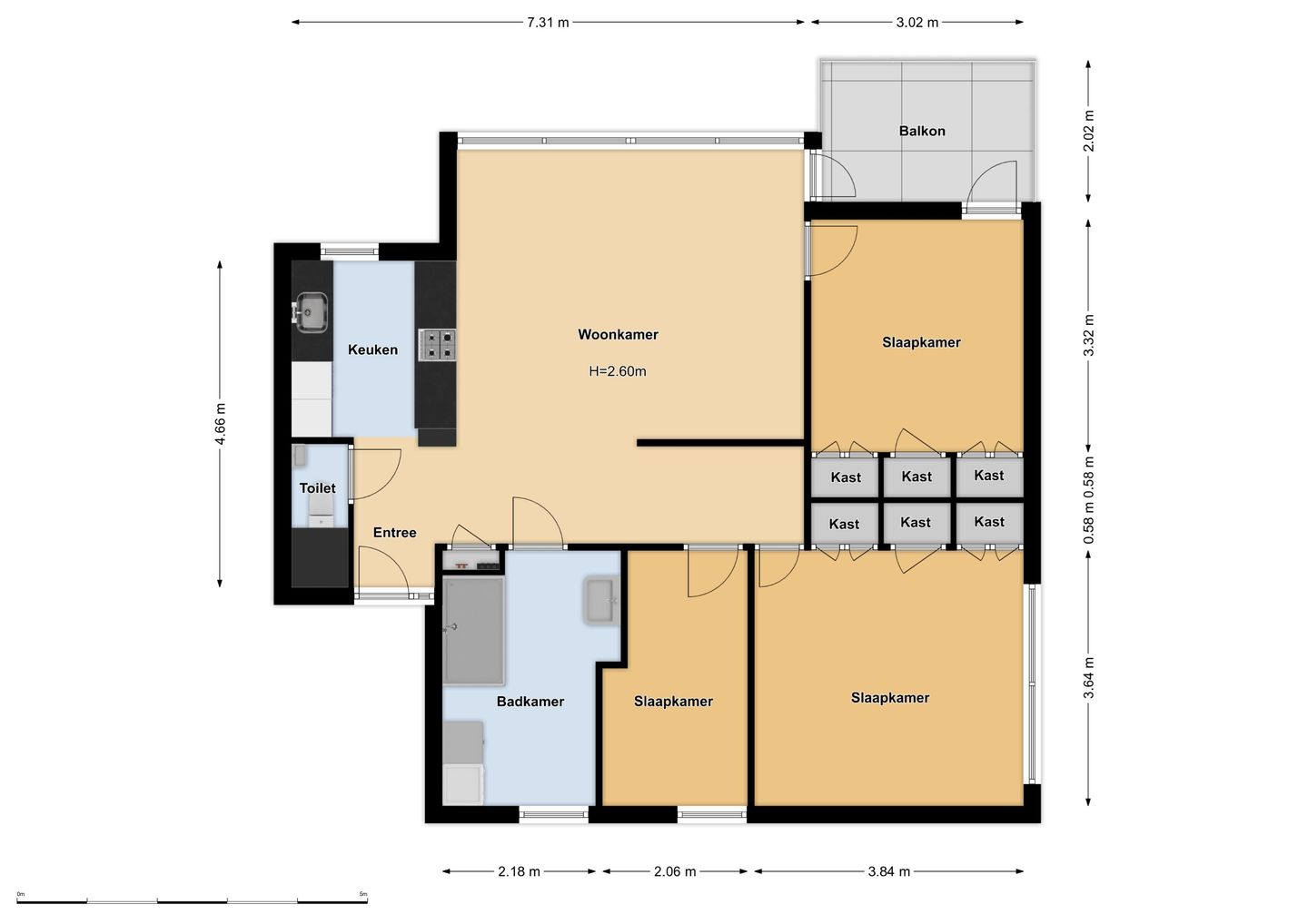 De woonkamer is ruim opgezet en wordt verlicht door de grote raampartijen. Vanuit de woonkamer heeft u toegang tot het balkon op het westen. 1 slaapkamer is te bereiken vanuit de woonkamer. Deze ruimte slaapkamer biedt toegang tot het balkon en is v.v. inbouwkasten met spots. Verder zijn er nog 2 slaapkamers aanwezig, waaronder de master-bedroom. De master-bedroom en 3e slaapkamerzijn ook voorzien van een inbouwkast. De badkamer is voorzien van een ruime douche, badkamermeubel met spiegel, designradiator, wasmachineopstelling en extra bergruimte. De woonkamer, slaapkamers en hal zijn voorzien van een nette laminaatvloer. De keuken is betegeld met marmertegels.