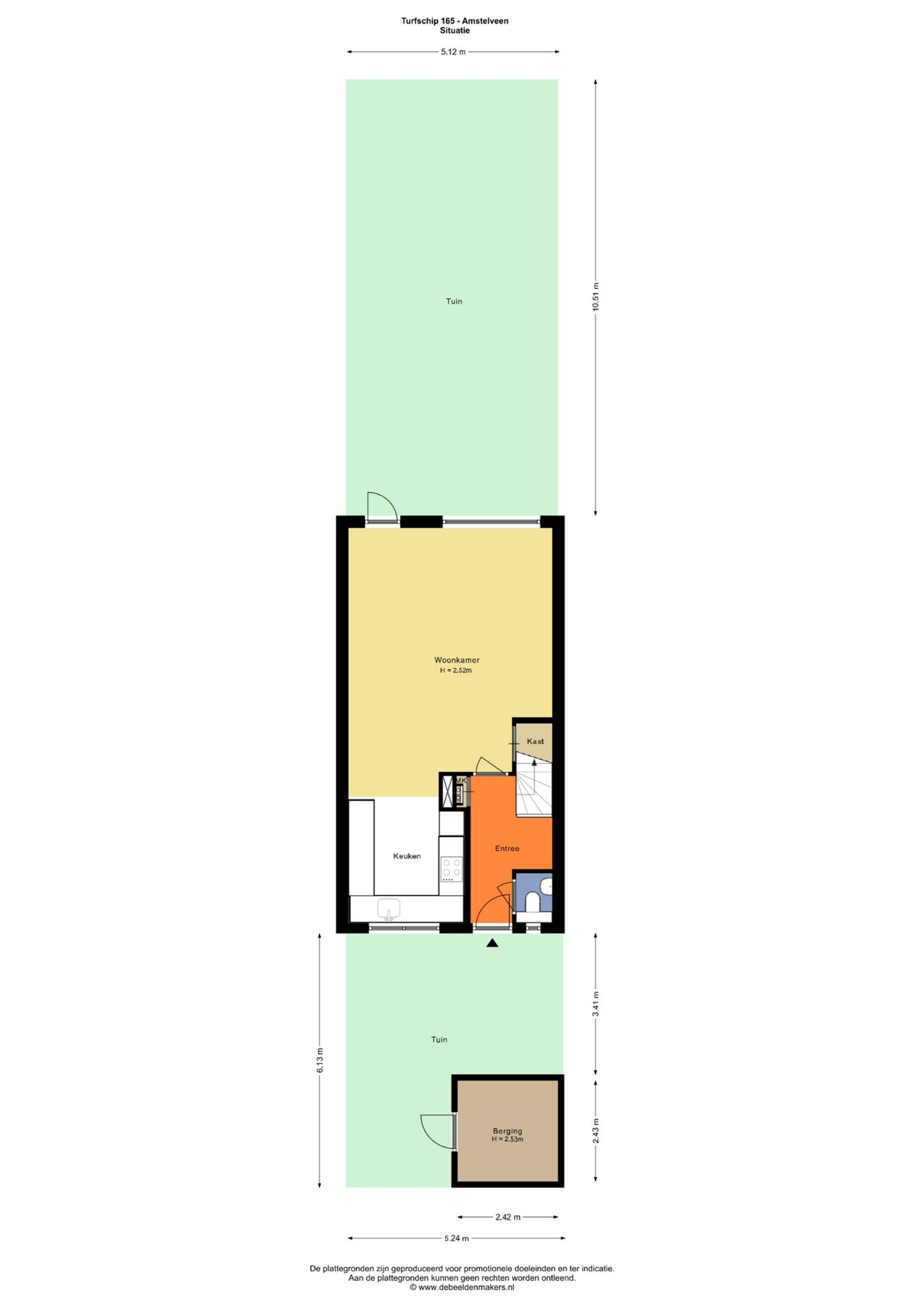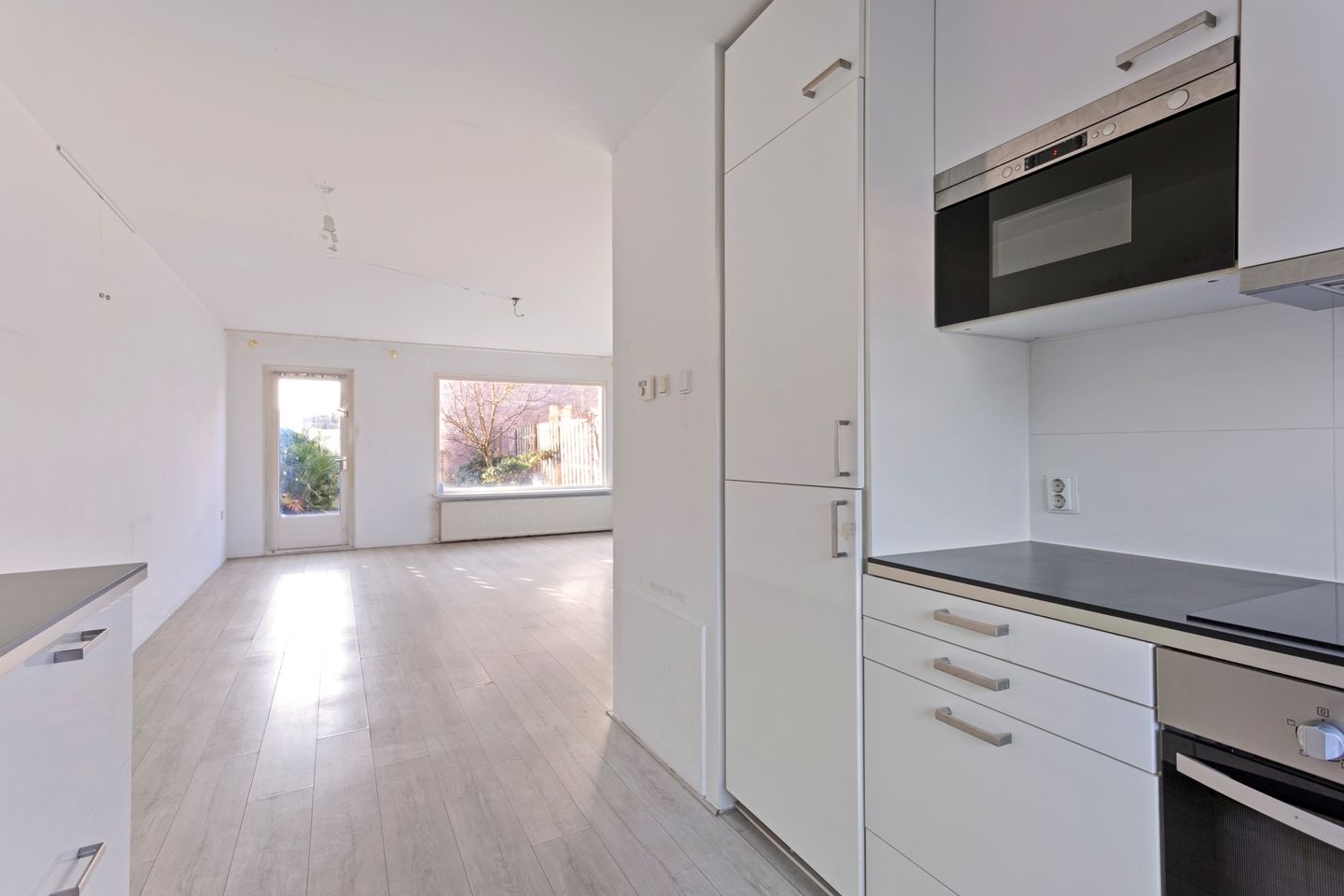 Via the front garden with spacious storage room you reach the front door. Entrance, with wardrobe, and toilet room meter cupboard. The open L-shaped kitchen is located at the front of the house and is equipped with built-in appliances, including a dishwasher, oven, induction hob, extractor hood and fridge/freezer. The bright living room at the rear offers lots of light. The garden is accessible via the living room.